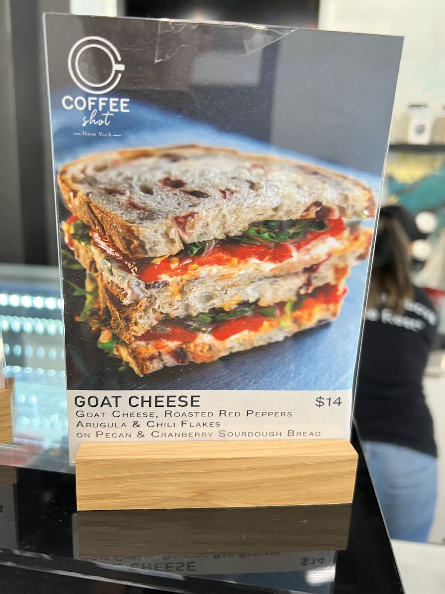 Arugula, goat cheese, roasted red peppers & chili flakes on pecan & cranberry sourdough bread.